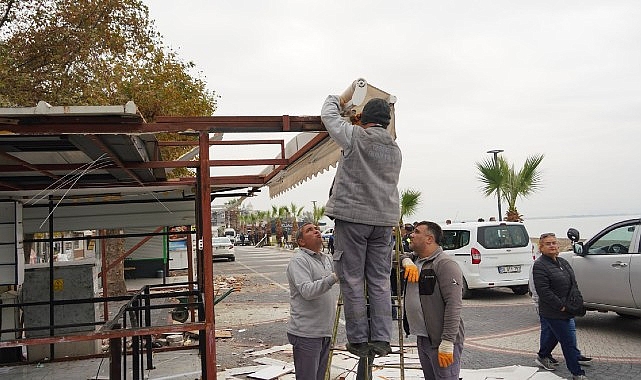 Edremit Belediyesi ekipleri, Akçay sahilinde çevre düzenleme çalışmaları kapsamında, çevreyi işgal ettiği ve görüntü kirliliğine yol açtığı tespit edilen büfeleri kaldırmaya devam ediyor.